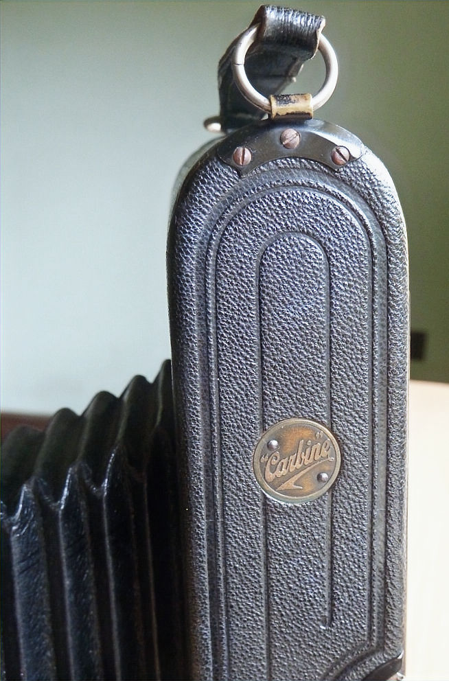 It says on the side, Carbine, on a brown round circular disc. But there is no number given, usually it will say on it somewhere something like No 4b Carbine or similar, but there is nothing on this camera at all to tell us which model it actually is.