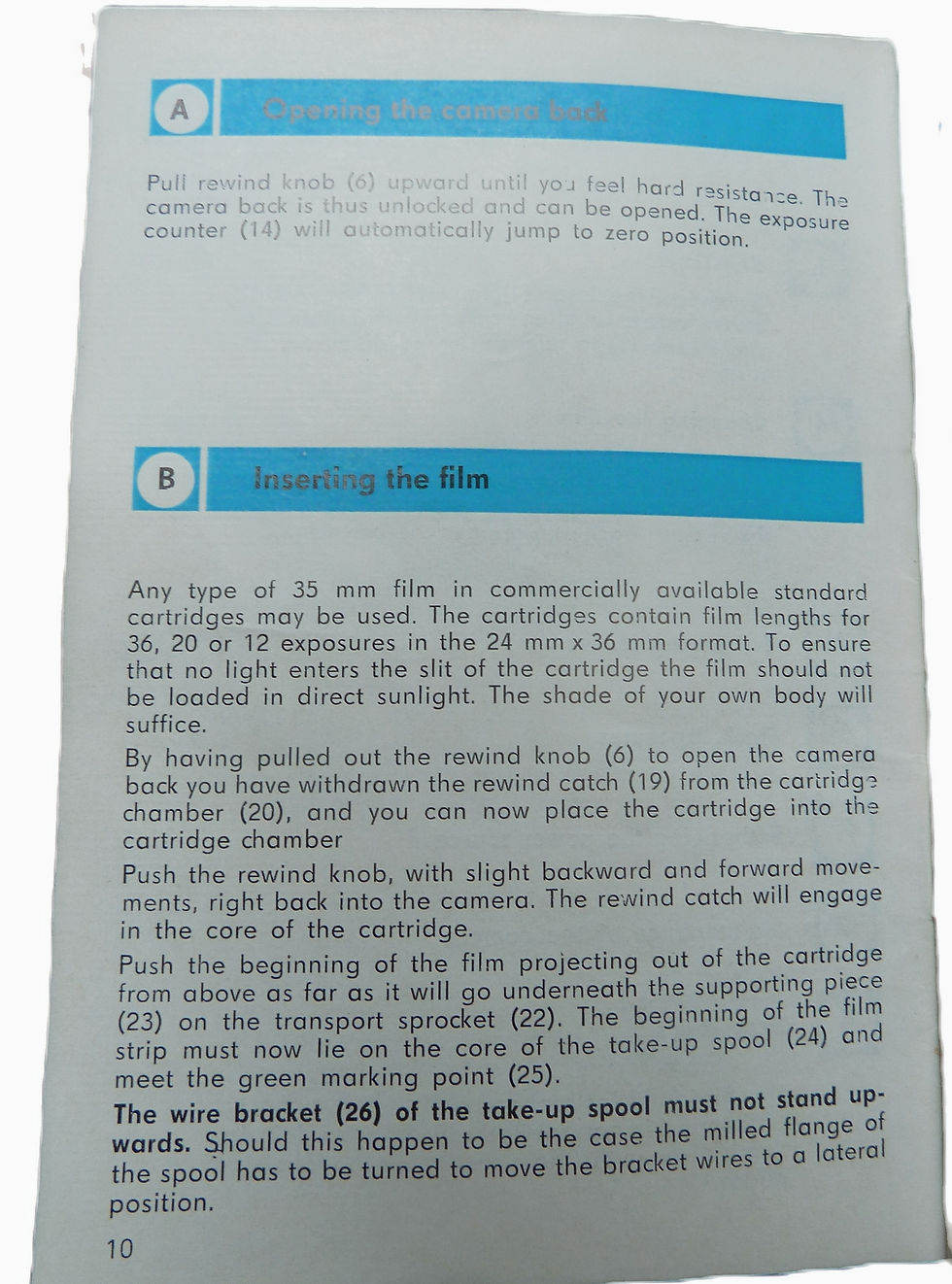 It looks quite easy, but believe me, getting the film under the little rectangular plate, which the Germans in their usual descriptive and imaginative prose they call the 'supporting piece' is as easy as playing the drums and firing a MG-42 machine gun at the same time. As you slide the film down under the supporting piece in the direction of the very helpful white arrow, the film puckers up and no longer sits parallel to the lines of the film guide, it heads off upwards towards the top of the camera, like it is trying to climb to the top of the Zugspitze. Getting the film to sit as illustrated in the handbook picture above is an art. An art that I don't have.