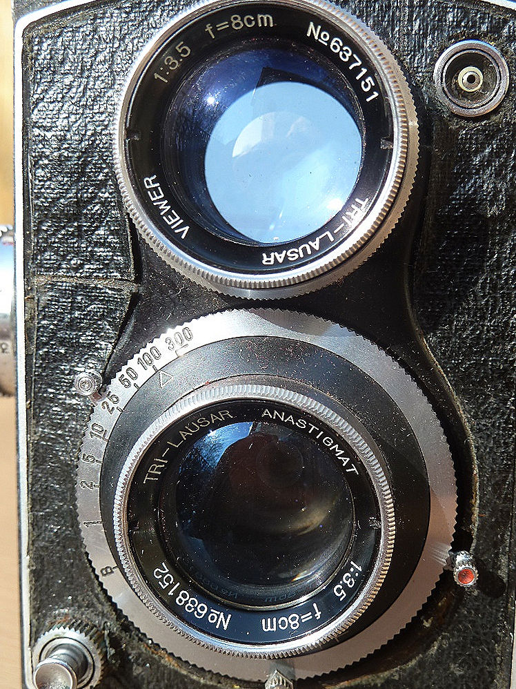 Right, let us see just what we have got. The taking lens is a bloomed 8cm (80mm) Tri-Lausar 3.5 Anastigmat. The lens number is 688152. Stops are 3.5, 4, 5.6, 8, 11, 16 and 22. The shutter has speeds marked B, 1, 2, 5, 10, 25, 50, 100, 300. So a quite decent speed selection. Some sources say this shutter is a Prontor shutter copy.